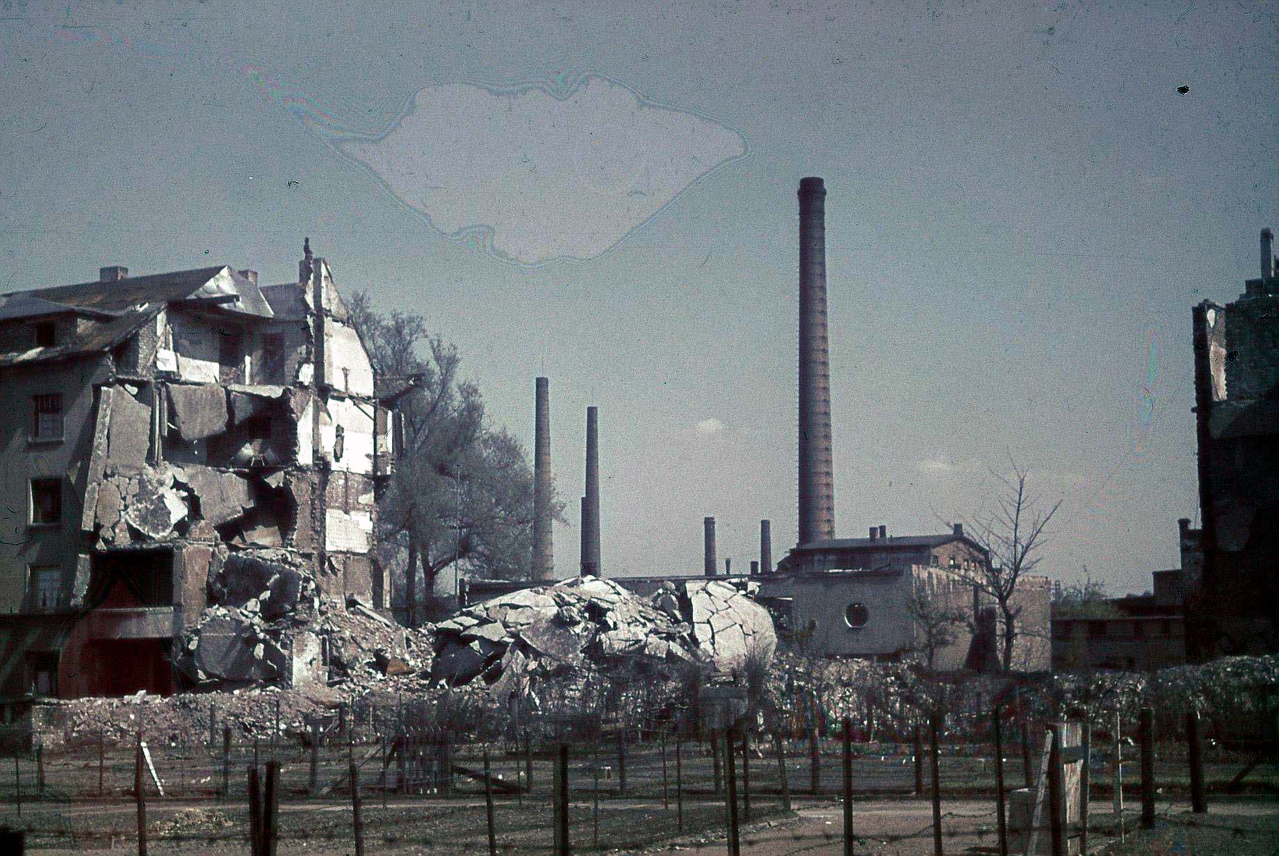 Fleischwarenfabrik Rosenkranz, im Hintergrund die ausgebrannten Ruinen